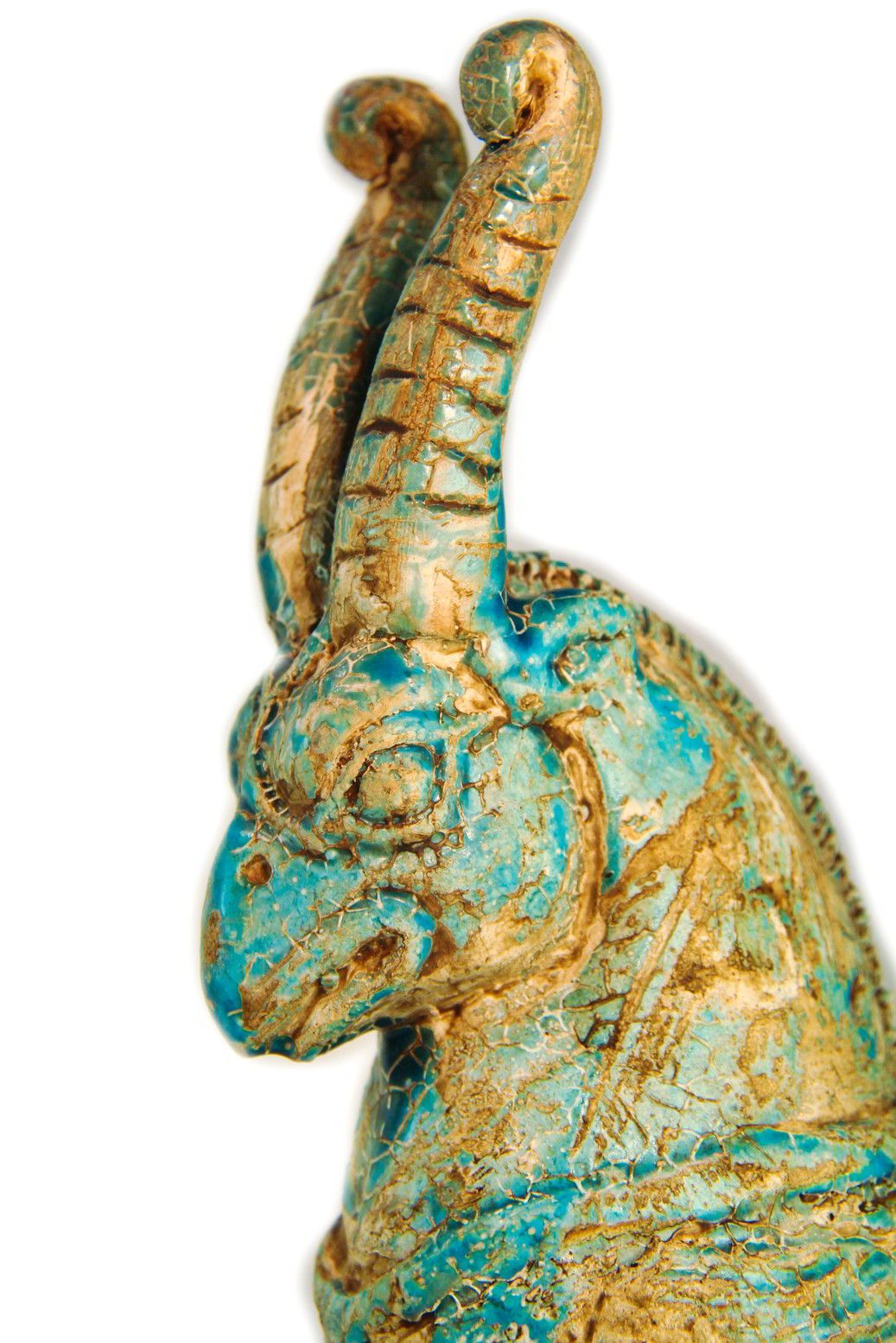 Riton ili posuda za piće u obliku glave mitske životinje Home. Napravljena je od gline koja je nakon oblikovanja prvi puta pečena na temperaturi od 850 stupnjeva. Potom je dodan premaz tirkiznom glazurom te je drugi puta pečena na temperaturi od 950 stupnjeva. Izrađena je u gradu Gazvinu, u Iranu. To je replika originalnog ritona koji je bio napravljen od čistog srebra. Potječe s područja Arzanjana, današnja istočna Turska, iz davnog 4. i 5. stoljeća pr.n.e. kada je Perzijskim carstvom vladala dinastija Ahamenida.