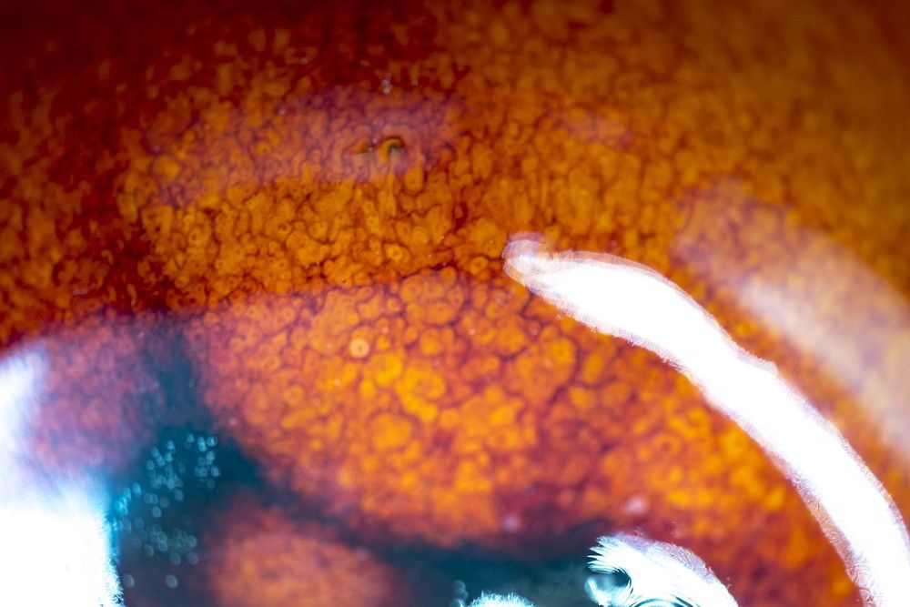 Unique one of a kind ceramic tea cup. Wheel thrown pottery for daily use, abstract effects with shiny orange and silver/golden glaze.